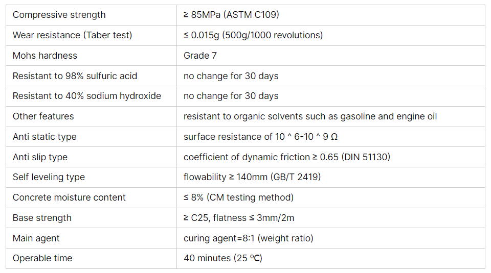 Offering powerful wear resistance, crack resistance, and waterproof features. VOC content ≤50g/L. Suitability for demanding environments. Compressive strength ≥85MPa. Mohs hardness Grade 7. Resistance to chemicals. Anti-static and Anti-slip.